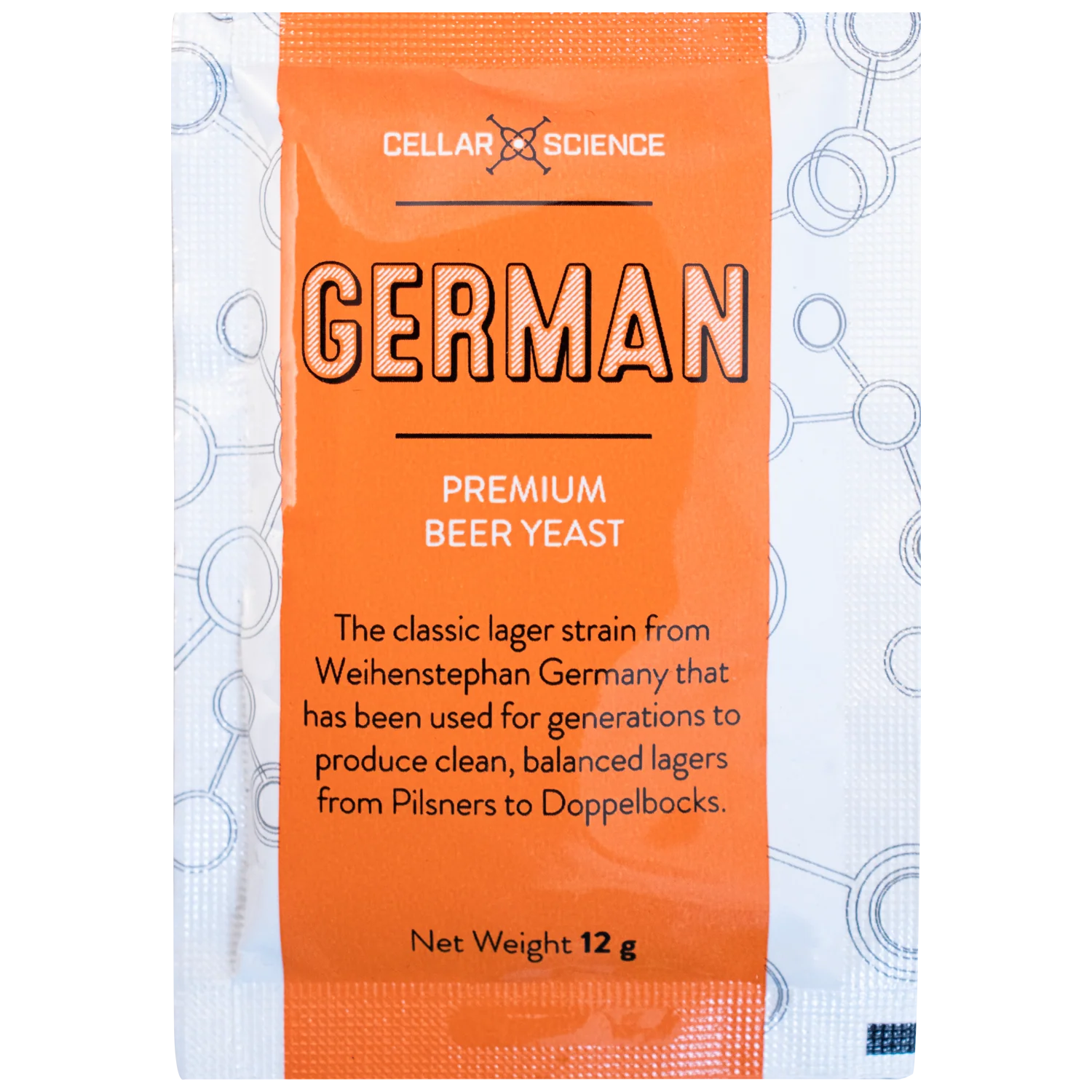 The classic lager strain from Weihenstephan Germany that has been used for generations to produce clean, balanced lagers from pilsners to doppelbocks. Like all our yeast, GERMAN is eligible for direct pitch straight into your wort. CellarScience provides 12g of yeast per sachet, which is up to 9% more than any other brand of dry yeast. Every batch of yeast is PCR tested to ensure quality. GERMAN has been selling to pro breweries for awhile but was just recently packaged down to sachets for homebrewers.